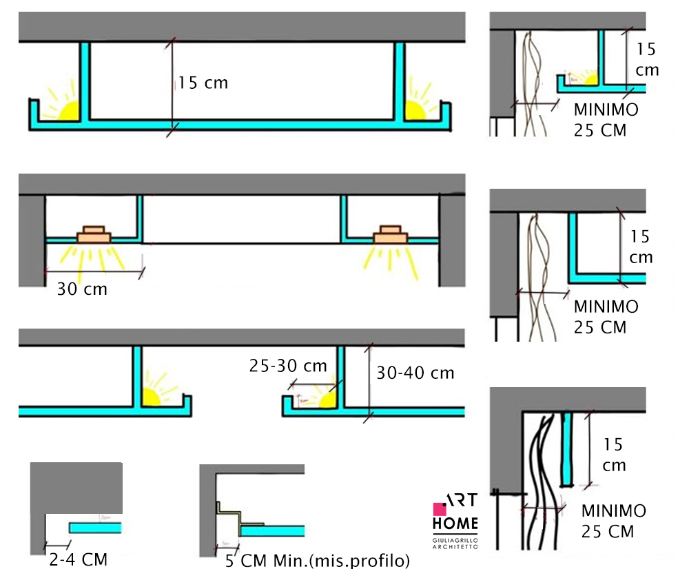 Solitamente si lascia uno spazio minimo fi di 1-2cm (il profilo più utilizzato è largo 12 millimetri) tra il controsoffitto soffitto e il muro laterale, sufficiente a dare profondità e leggerezza visiva all’ambiente. Maggiore sarà lo spazio, meno naturale sarà l’effetto.