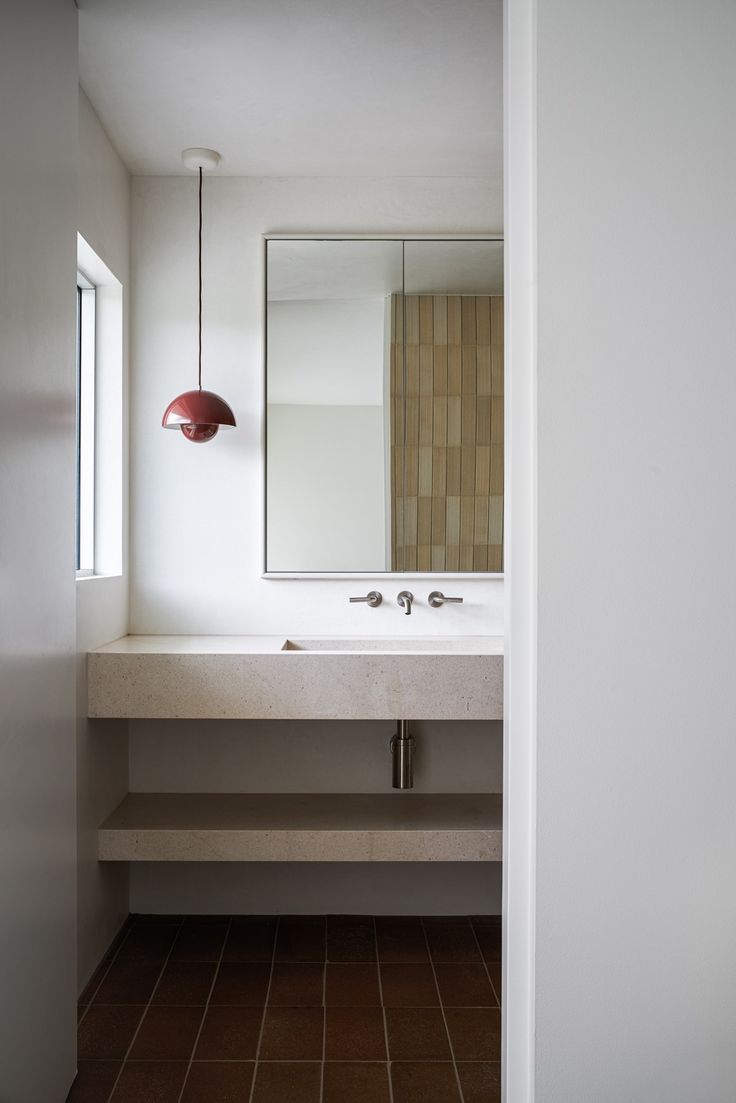 Un colore uniforme, una superficie continua rendono la stanza più essenziale, lasciando spazio agli arredi, ai mobili lavabo che spesso hanno una valenza estetica maggiore, per via dei materiali, della forma o dell’impatto visivo a livello di volumi, come in questo caso dove legno e marmo padronaggiano in un angolo unico all’interno della sala da bagno.